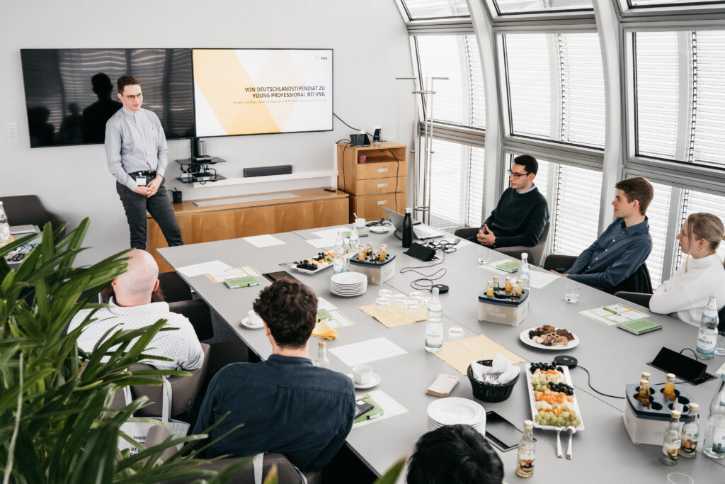 Die Deutschlandstipendiaten der Mitteldeutschen Stiftung Wissenschaft und Bildung waren am 25. März 2025 bei ihrer Stifterin VNG zu Gast, um den Konzern kennenzulernen und in einen aktiven Austausch mit Referenten aus verschiedenen Fachbereichen zu treten.